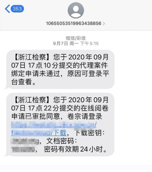 案件承辦檢察機關(guān)受理申請后,律師會收到浙江檢察APP平臺發(fā)來的服務已辦理的短信提醒,在互聯(lián)網(wǎng)電腦上打開短信預留的鏈接地址,經(jīng)掃碼、動態(tài)人臉核驗通過后,即可下載代理案件的電子卷宗。申請通過后,須在24小時內(nèi)進行下載。
